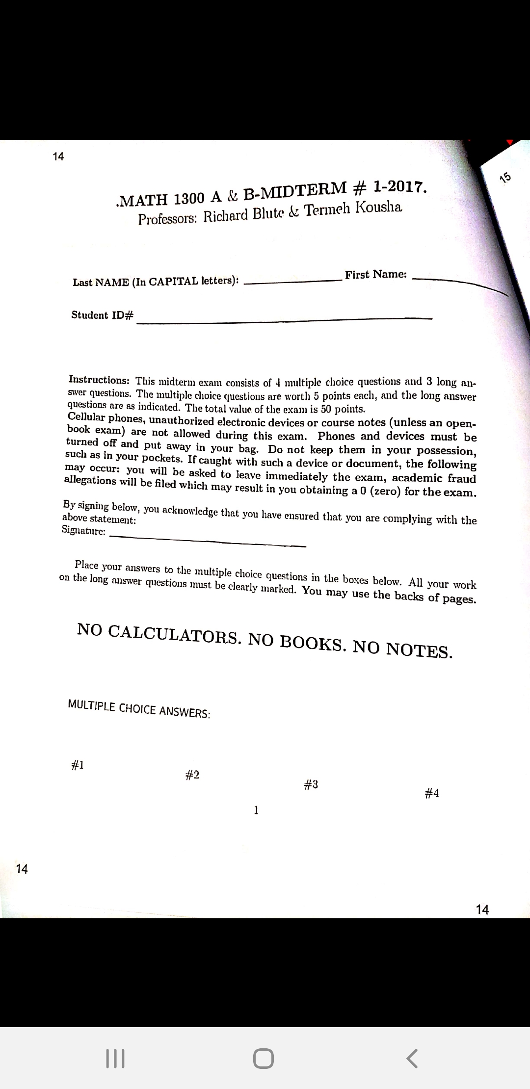 MAT1300 PRACTICE MIDTERM 2017 (TERMEH KOUSHA &RICHARD BLUTE)