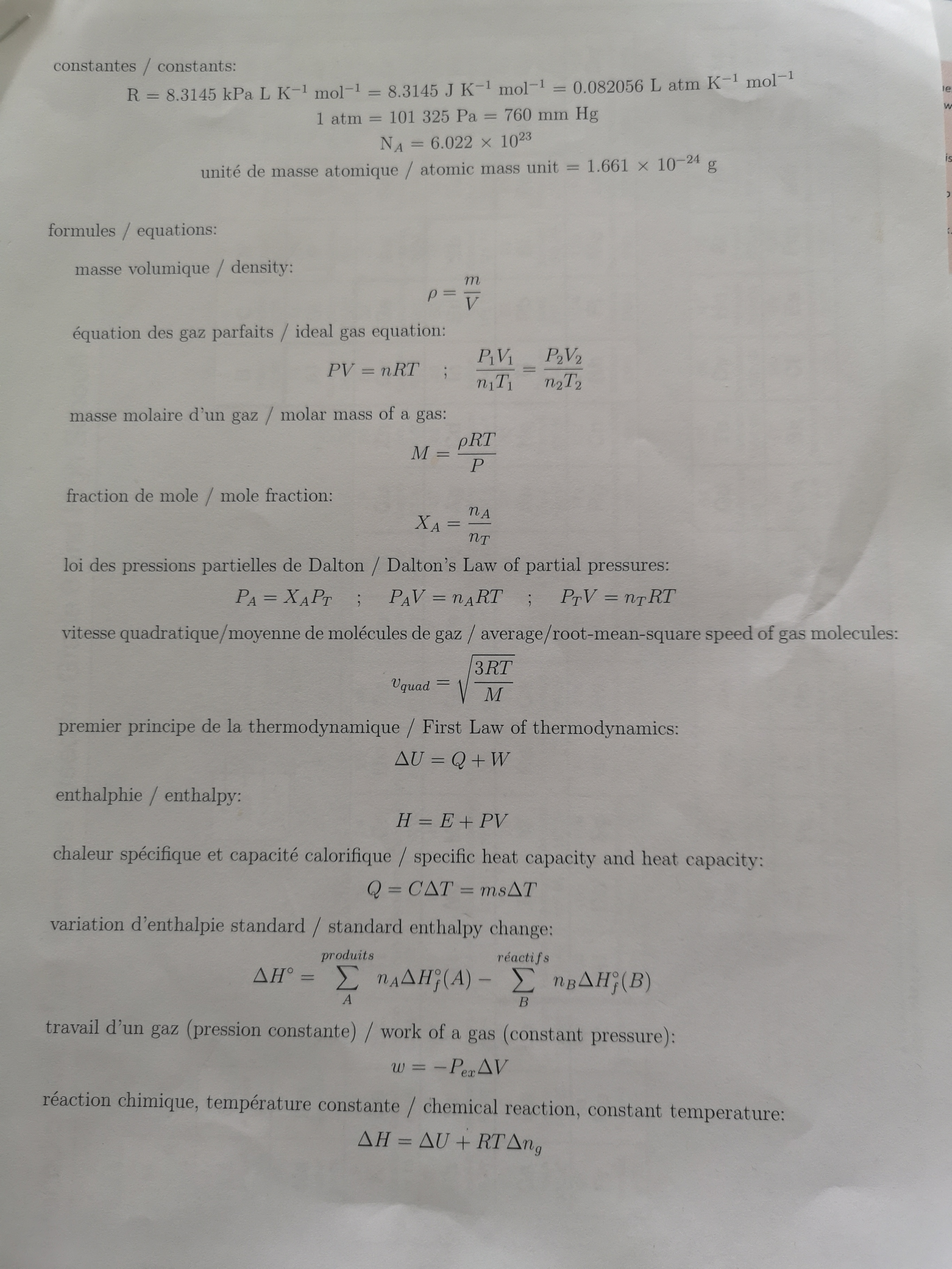 fundamental chemistry (chm 1100)formula sheet
