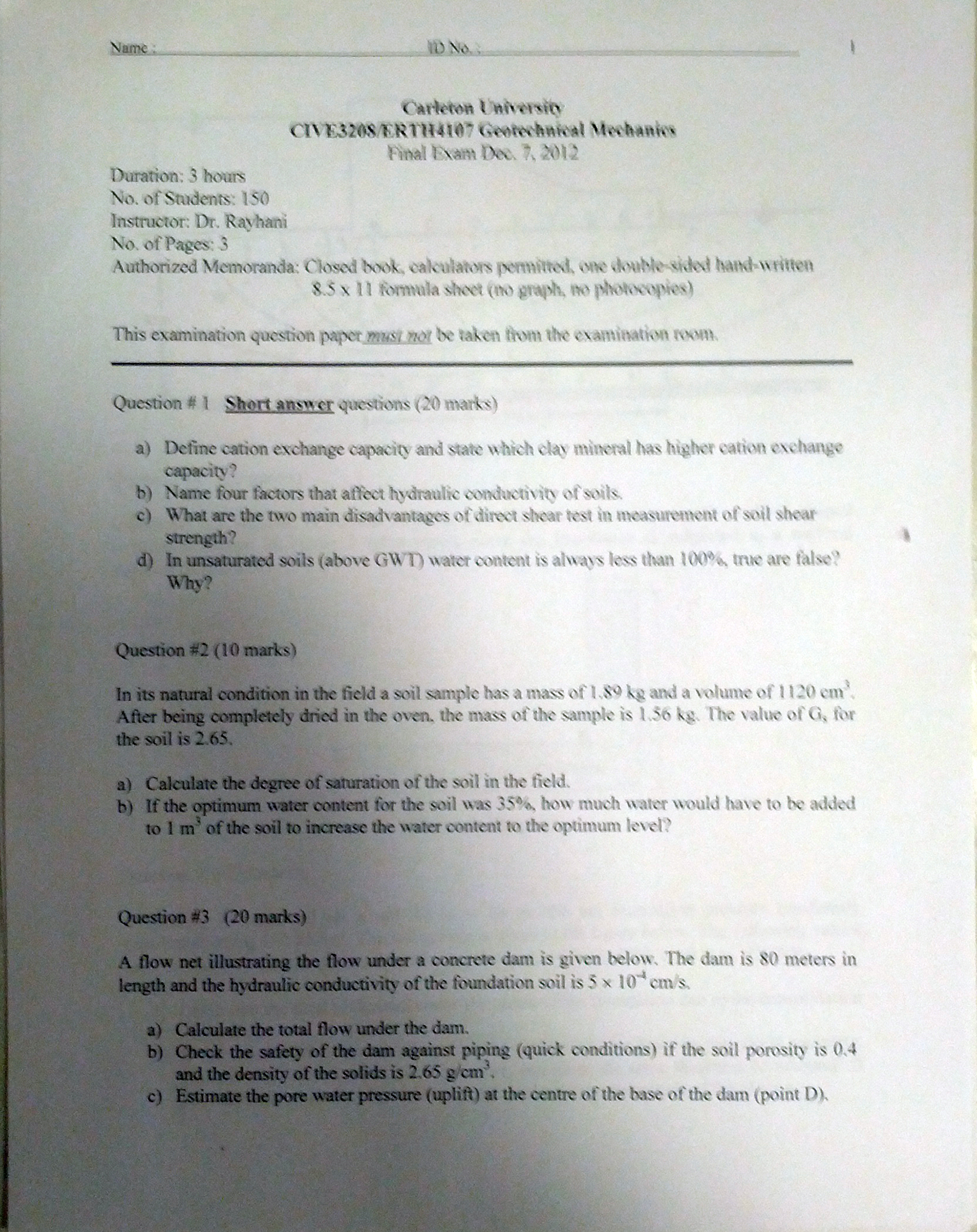 CIVE 3208 2012 Final Exam (Prof. M. Rayhani)